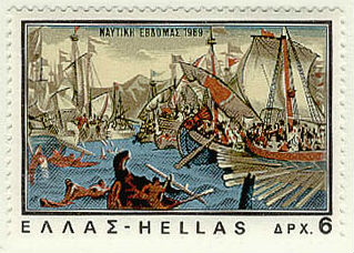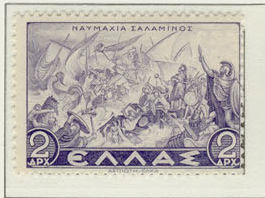 Έκδοση «Ελλάς και Θάλασσα». Σχεδίαση Π. Γράββαλος. Η ναυμαχία της Σαλαμίνος από πίνακα του Κ. Βολανάκη.