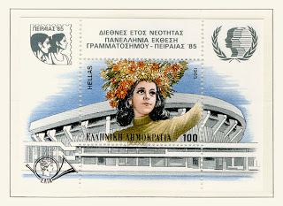 Μπλοκ – φεγιέ για το διεθνές έτος νεότητας. Σχεδίαση Π. Γράββαλος. Εκτύπωση ΑΣΠΙΩΤΗ – ΕΛΚΑ. Πανελλήνια έκθεση γραμματοσήμου – Πειραιάς ’85. Κοπέλα στεφανωμένη με λουλούδια. Πίσω της το Στάδιο Ειρήνης και Φιλίας.