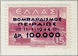 Έκδοση για τον βομβαρδισμό του Πειραιά που έγινε στις 11.1.1944. Επισημάνθηκαν δέκα γραμματόσημα των τοπίων του 1942 και των ανέμων του 1943 με λιθογραφική επισήμανση: