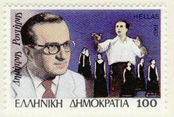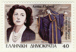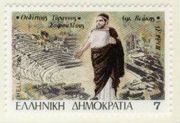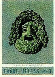 Έκδοση για τα 2500 χρόνια τους ελληνικού θεάτρου. Σχεδίαση Α. Τάσσος. Προσωπίδα του 4ου αιώνα π.χ. που βρέθηκε το 1959 στην Φίλωνος και Γεωργίου Α΄.
