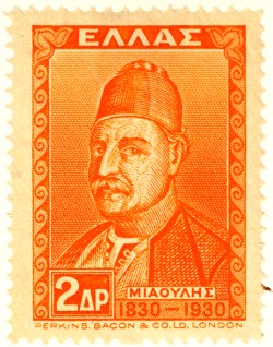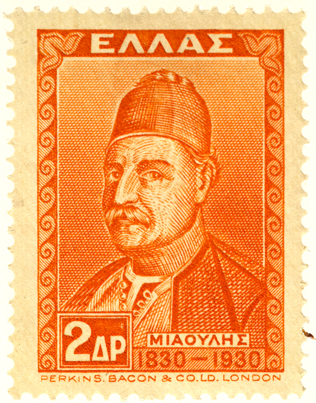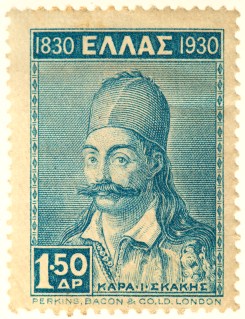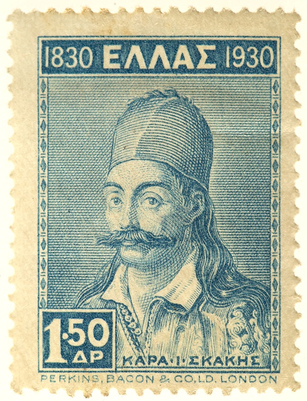 Έκδοση για τα εκατό χρόνια της ελληνικής ανεξαρτησίας, αξία 1.50 δρχ. Τυπώθηκε στο Λονδίνο.Γεώργιος Καραϊσκάκης 1782-1827. Η δράση του ήρωα που συνδέθηκε με τον ερχομό του στον έρημο πειραϊκό χώρο, το στρατόπεδό του στα Ταμπούρια και τις μάχες που έδωσε, καθώς και το ειδικό μνημείο στο Νέο Φάληρο που βρίσκονται τα οστά του. Η αξία των 2 δραχμών, κόκκινο πορτοκαλί παριστά τον Ανδρέα Μιαούλη. Έκτισε το σπίτι του μπροστά από το Ναό του Αγίου Σπυρίδωνα και έδωσε το όνομά του στην ομώνυμη Ακτή Μιαούλη και ετάφη κοντά στην είσοδο του Λιμένα.