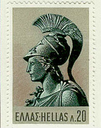 Έκδοση για την έκθεση της πολεμικής ιστορίας των Ελλήνων. Κεφαλή με περικεφαλαία του χάλκινου αγάλματος της Αθηνάς (2ος αιώνας π.χ.) που