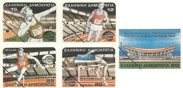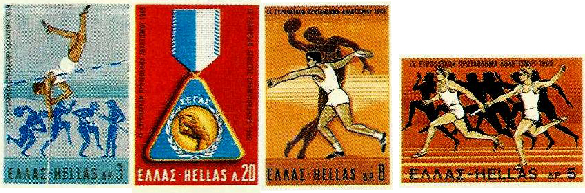 Αναμνηστική έκδοση για το 9ο Ευρωπαϊκό Πρωτάθλημα Αθλητισμού. Τέσσερις αξίες με ελεύθερο αθλητικό θέμα σχεδιασμένες από τους Γ. Βελισσαρίδη και Π. Γράββαλο.