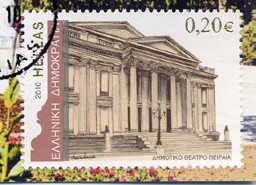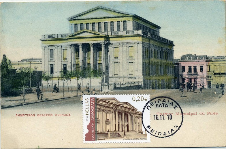 Νεότερα αρχιτεκτονικά μνημεία. Πολύ φτηνό σε αξία γραμματόσημο για το ακριβό μας Δημοτικό Θέατρο (δείχνει την πρόσοψη). Βγήκε σε 1.500.000 κομμάτια σε φύλλα των 25 τεμαχίων. Με χρυσά γράμματα η λέξη HELLAS και η τιμή. Σχεδίαση Χ. Παπανικολάου.