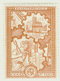 Έκδοση ανασυγκροτήσεως, 700 δρχ. – Βιομηχανία. Σχεδίασε ο Γιάννης Κεφαλληνός (1894-1957). το επάνω γρανάζι περιέχει συμβολικά κάποια εικόνα λιμανιού, φουγάρα, πλοίο και κτήρια που μοιάζουν κατά πολύ με εκείνα της εισόδου του δικού μας λιμένα.