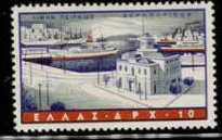 Τακτική αεροπορική έκδοση λιμένων. 10 δραχμών. Το λιμάνι του Πειραιά. Κυκλοφόρησε σε εννέα εκατομμύρια αντίτυπα. Σχεδίαση του χαράκτη Α. Τάσσου (Αναστάσιος Αλεβίζος 1914-1985).
