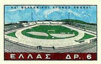 Αναμνηστική έκδοση για τους 24ους Βαλκανικούς Αγώνες. Σχεδίαση Α. Τάσσος. Το Στάδιο Καραϊσκάκηκαι το Νέο Φάληρο.