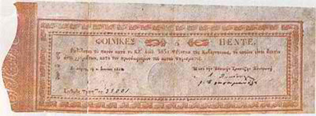 Το 1831 αναγκάσθηκε ο Ιωάννης Καποδίστριας να κυκλοφορήσει χάρτινους φοίνικες [3]. Την απόφασή του αυτή ο πρώτος κυβερνήτης της χώρας μας την αιτιολόγησε με λόγια που μακάρι να τα ακούγαμε και σήμερα από τους νυν κυβερνώντες μας. «…χρεωστούντες να εξεύρωμεν τον τρόπον να θεραπεύσωμεν την ανάγκην ταύτην (δηλαδή την έλλειψη χρημάτων) χωρίς να επιφορτίσωμεν με νέους φόρους την γεωργίαν και το εμπόριον, τα οποία πρέπει να αναζωογονήσωμεν ως παθόντα εκ της παρελθούσης ανωμαλίας…».