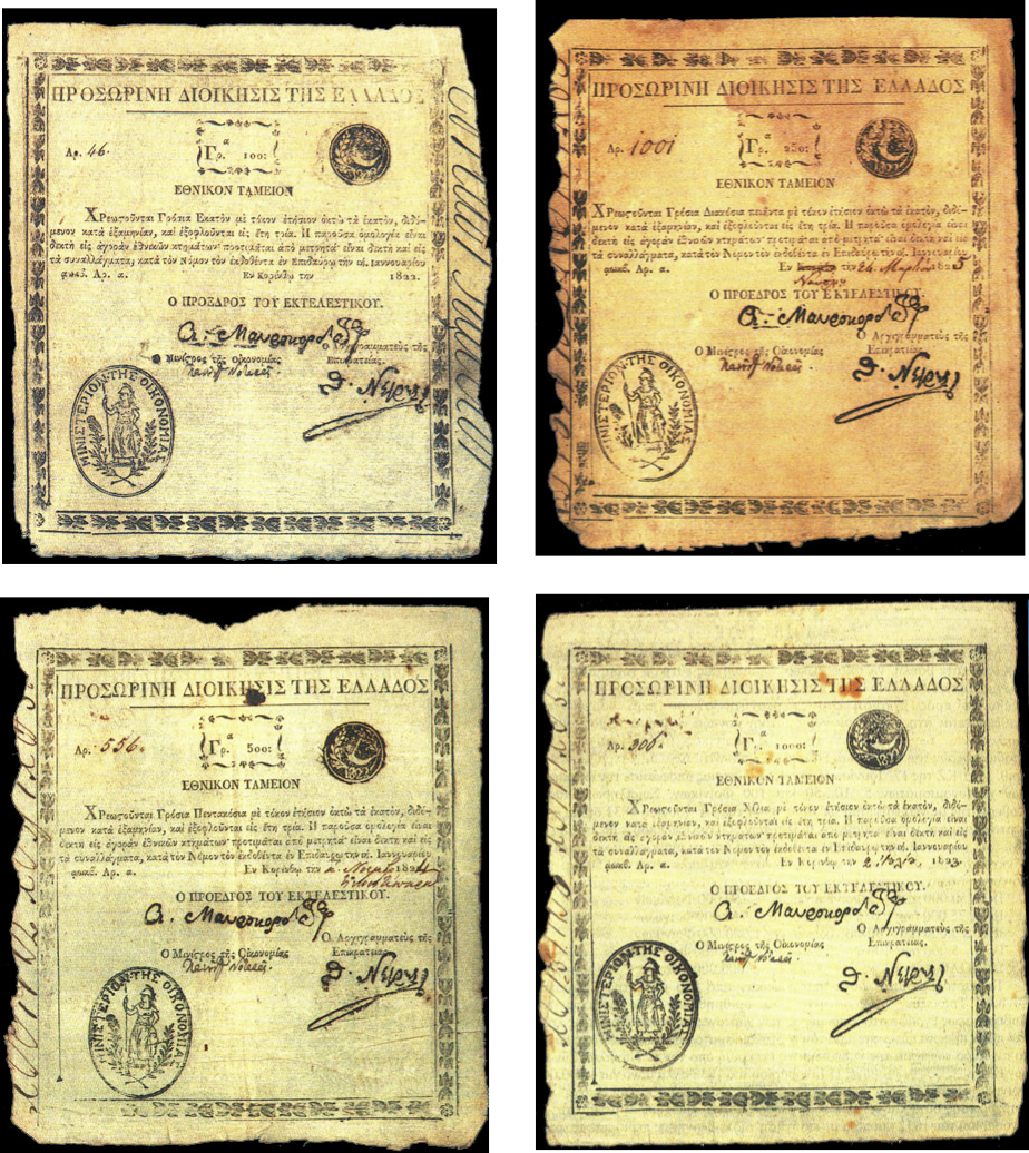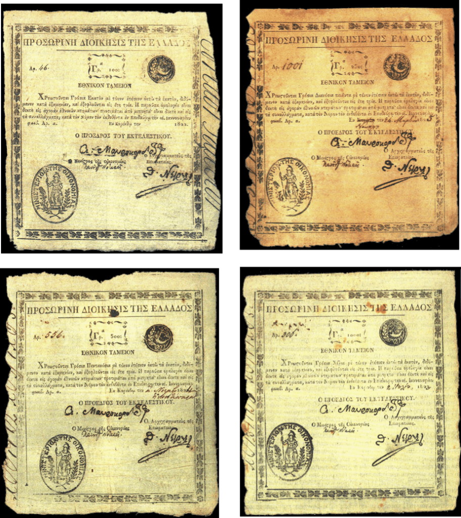 Μετά την καταστροφή του Δράμαλη στα Δερβενάκια 26-27/7/1822 η προσωρινή κυβέρνηση με απόφαση του εκτελεστικού σώματος τύπωσε χαρτονομίσματα αξίας 100, 250, 500, 700 και 1000 γροσίων για την ενίσχυση του Εθνικού Αγώνα. Τα χαρτονομίσματα αυτά δεν είχαν σχεδόν καμία ανταπόκριση ούτε από τους Έλληνες ούτε από τους ξένους και η αξία του μηδενίστηκε.