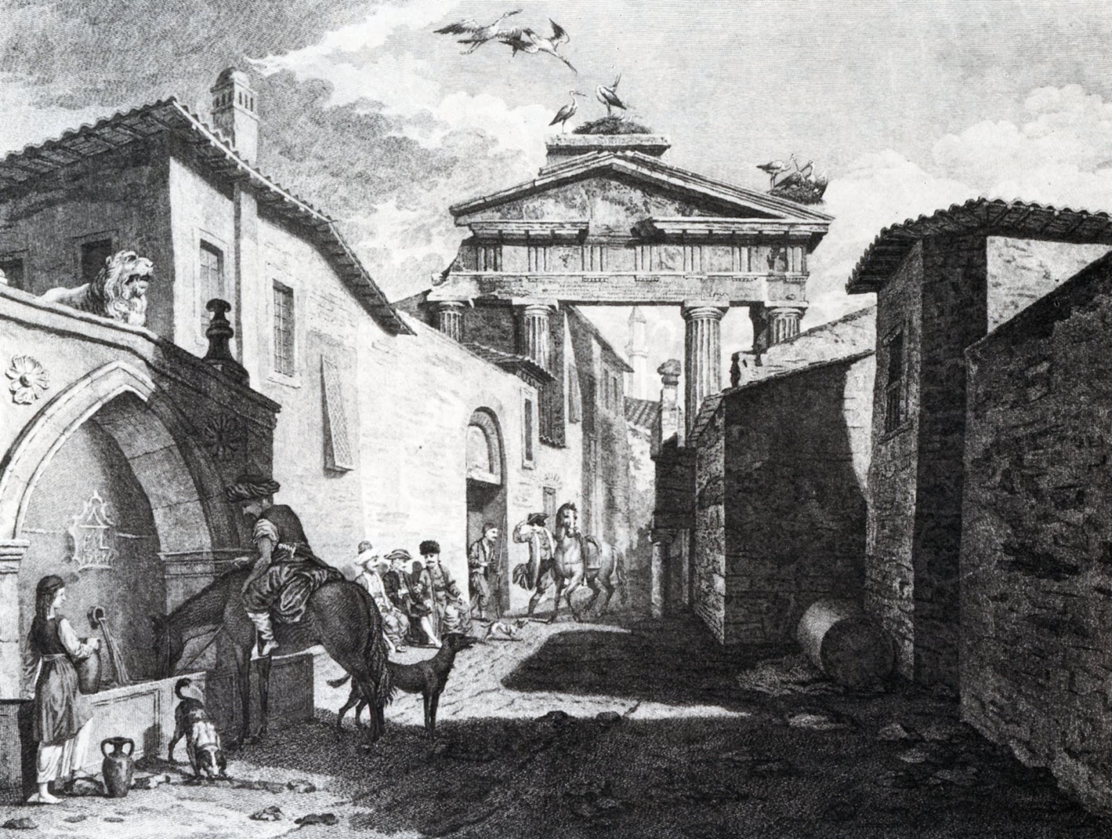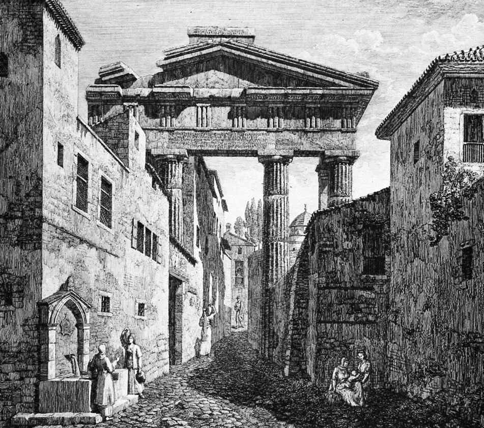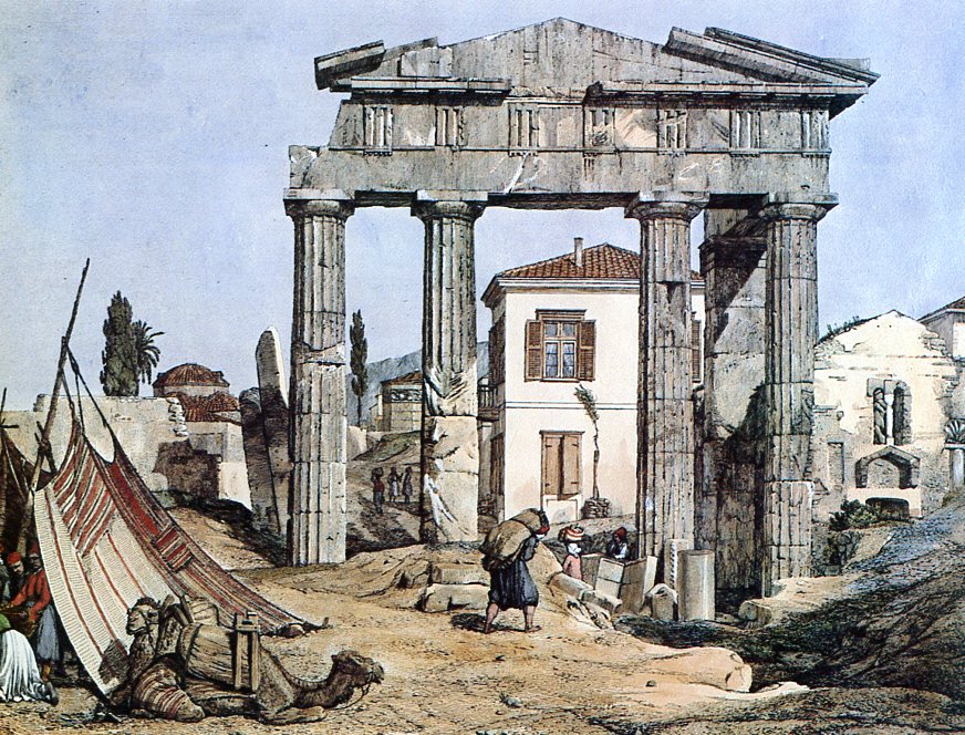 (Σε σχεδιάσματα του 1809 η επιγραφή του Αδριανού φαίνεται εντειχισμένη σε σπίτι στηριγμένο πάνω στο αρχαίο κτίσμα.