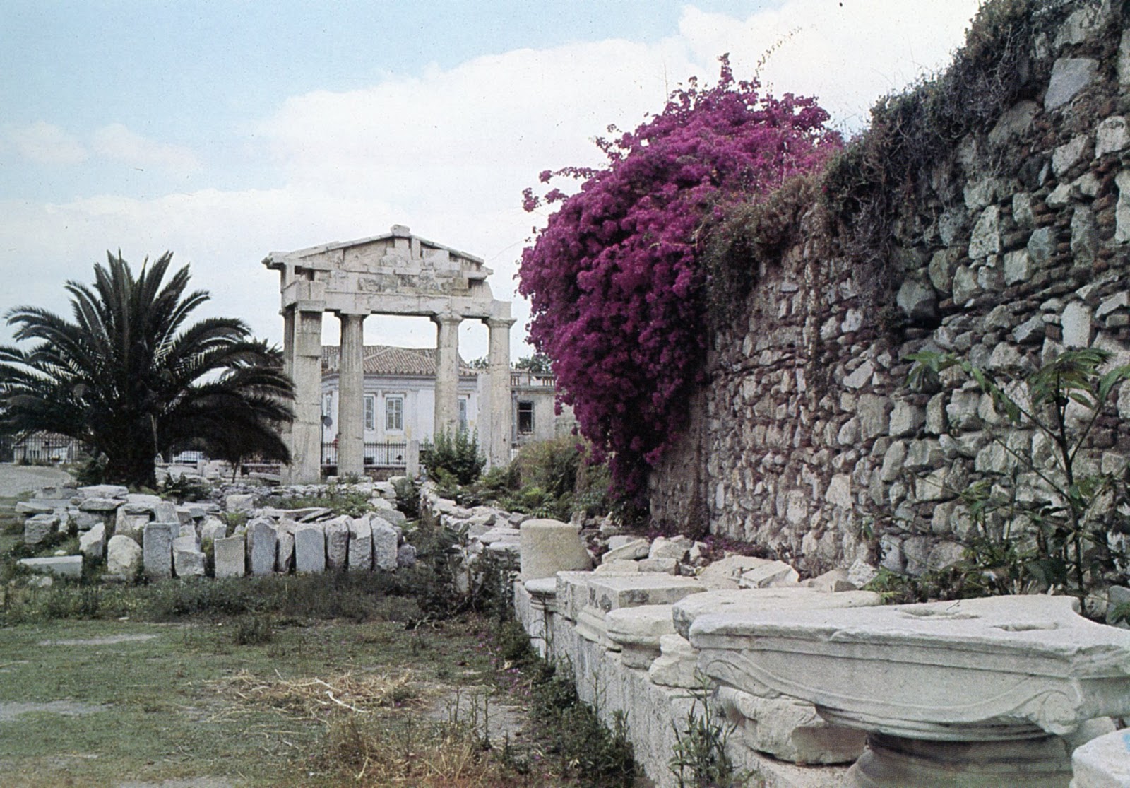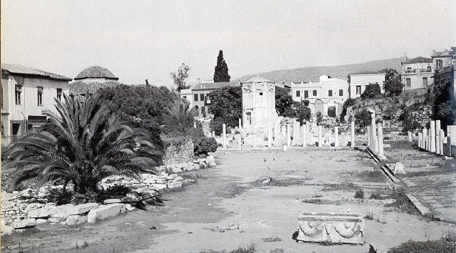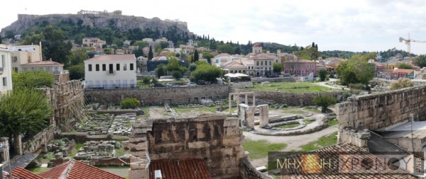 Η Ρωμαϊκή Αγορά βρίσκεται μεταξύ των οδών Πελοπίδα, Μάρκου Αυρηλίου, Πολυγνώτου, Διοσκούρων και Επαμεινώνδα και σώζεται κατά το ήμισυ περίπου. Δύο πρόπυλα, ένα στη δυτική πλευρά δωρικό –η πύλη της Αρχηγέτιδος Αθηνάς– (δεξιά) και ένα στην ανατολική πλευρά ιωνικό με αρράβδωτους κίονες (αριστερά) ήταν οι κύριες είσοδοι του κτηρίου. Πανοραμική φωτογραφία Χρ. Βασιλόπουλος…