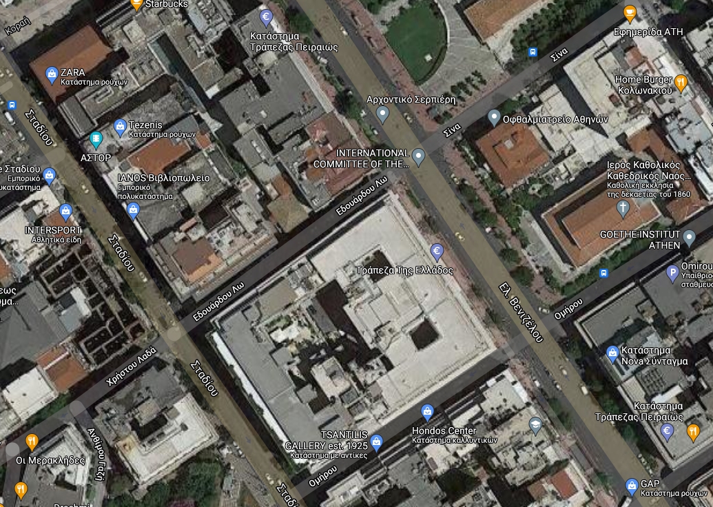Στο δρόμο αυτό υπάρχουν μόνο τρία οικοδομικά συγκροτήματα, της Τραπέζης Ελλάδος, της Αγροτικής Τράπεζας, – πρώην αρχοντικό Σερπιέρη, – με εισόδους από την οδόν Πανεπιστημίου, και του πάλαι ποτέ ξενοδοχείου Εσπέρια με είσοδο από την οδό Σταδίου. Είναι ο μοναδικός δρόμος της Αθήνας που δεν έχει κανένα νούμερο.