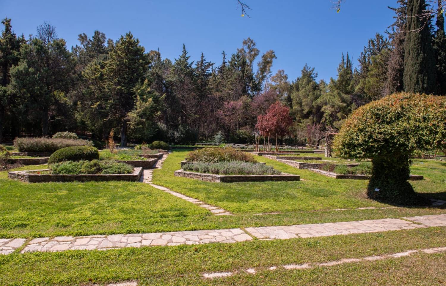 Τα 200 περίπου στρέμματα του Κήπου είναι καλλιεργημένα και φιλοξενούν περίπου 4.000 είδη φυτών. Αριστερά από την Κεντρική Είσοδο έχει διαμορφωθεί το Τμήμα Ιστορικών Φυτών του Κήπου, ένα τμήμα που δεν συναντάται σε κανένα άλλο Βοτανικό Κήπο στον κόσμο όπως μας πληροφόρησαν οι φροντιστές του. Εκεί φιλοξενούνται είδη που αναφέρονται στην Αρχαία Ελληνική μυθολογία, στην Παλαιά και στην Καινή Διαθήκη, για παράδειγμα ο Νάρθηκας, στον βλαστό του οποίου σύμφωνα με τον μύθο ο Προμηθέας έκρυψε τη φωτιά και τη μετέφερε κρυφά από τους θεούς στους ανθρώπους. Η αφιερωμένη στην Αφροδίτη μυρτιά που με τους κλάδους της η θεά κάλυψε το γυμνό σώμα της όταν βγήκε από τη θάλασσα, καθώς επίσης και η άκανθος, από τα φύλλα της οποίας προήλθε η έμπνευση για τα κιονόκρανα κορινθιακού ρυθμού. Ανάμεσα σε αυτά, το κώνειο με το οποίο θανατώθηκε ο φιλόσοφος Σωκράτης.