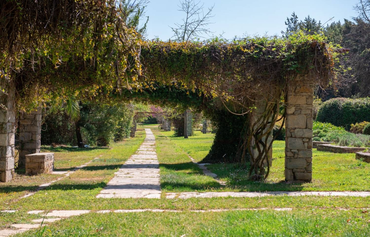 Τα καλλωπιστικά φυτά στα παρτέρια προέρχονται από όλον τον κόσμο, aνάμεσά τους κολομπίνες, ίριδες, αστέρες και πολλά άλλα που δίνουν άρωμα όλες τις εποχές, ακόμα χειμώνα. Συνεχίζοντας τη βόλτα προς τα δεξιά της κεντρικής εισόδου η βλάστηση γίνεται πιο πυκνή και ο επισκέπτης εισέρχεται στον Δενδρώνα που φιλοξενεί ψηλούς κορμούς και θάμνους από κάθε σχεδόν ήπειρο, από την Ωκεανία ως τη Αφρική και τη Μεσόγειο ως την Αμερική.