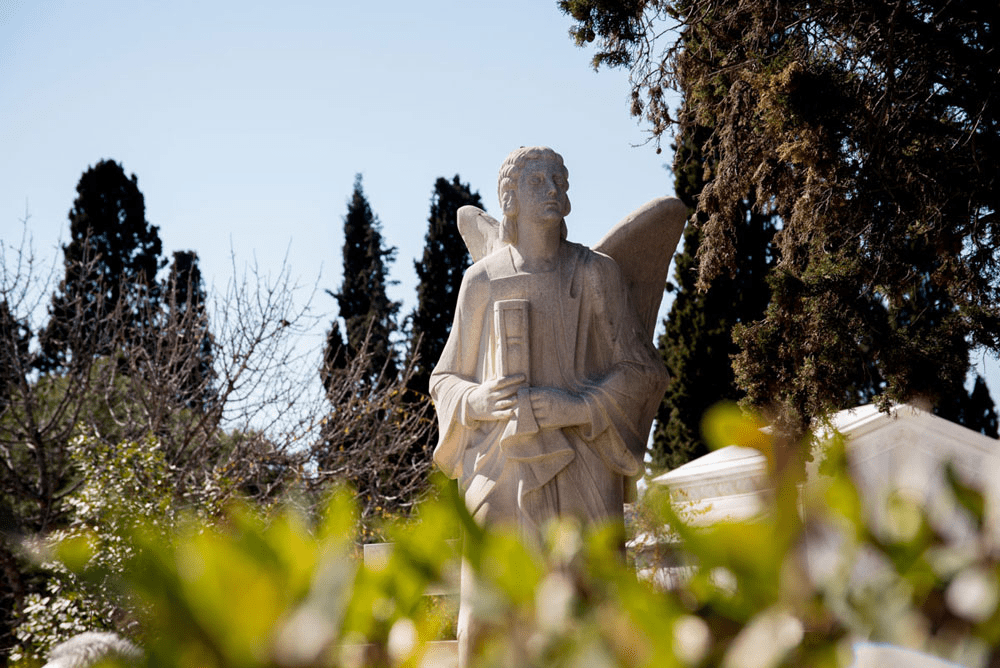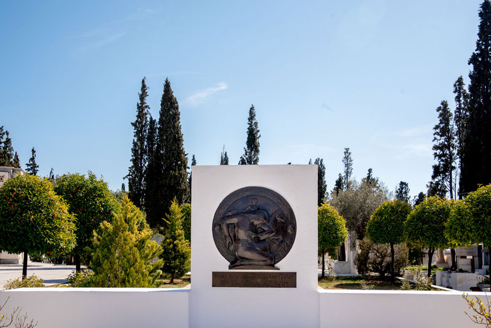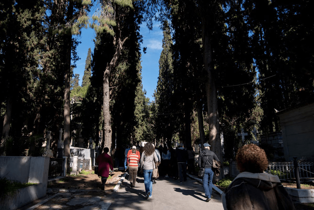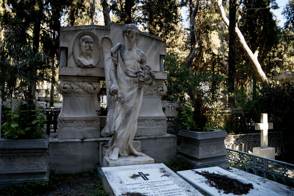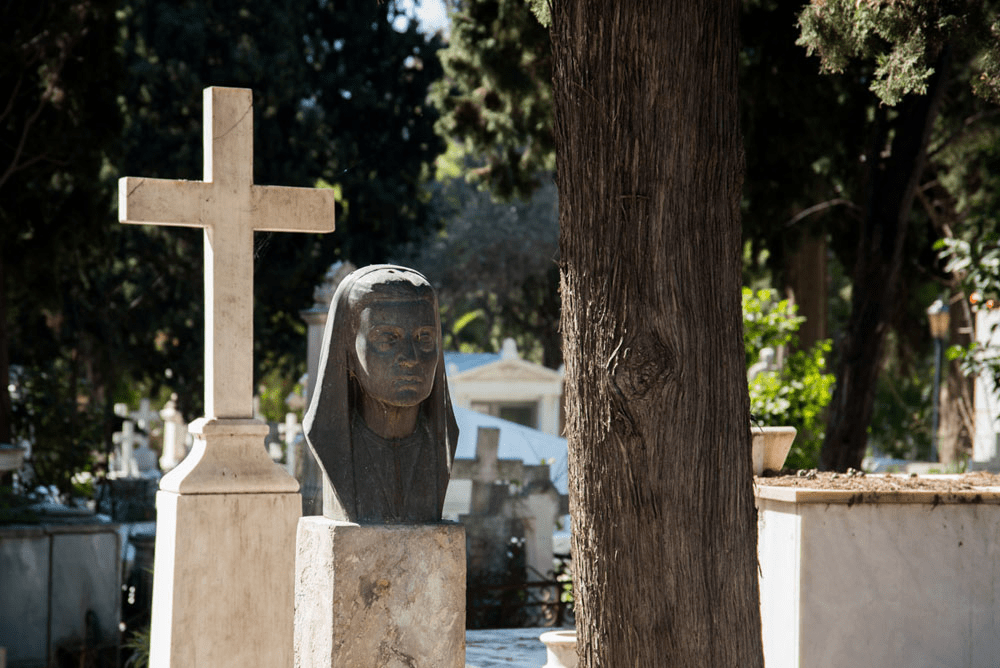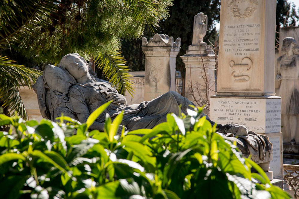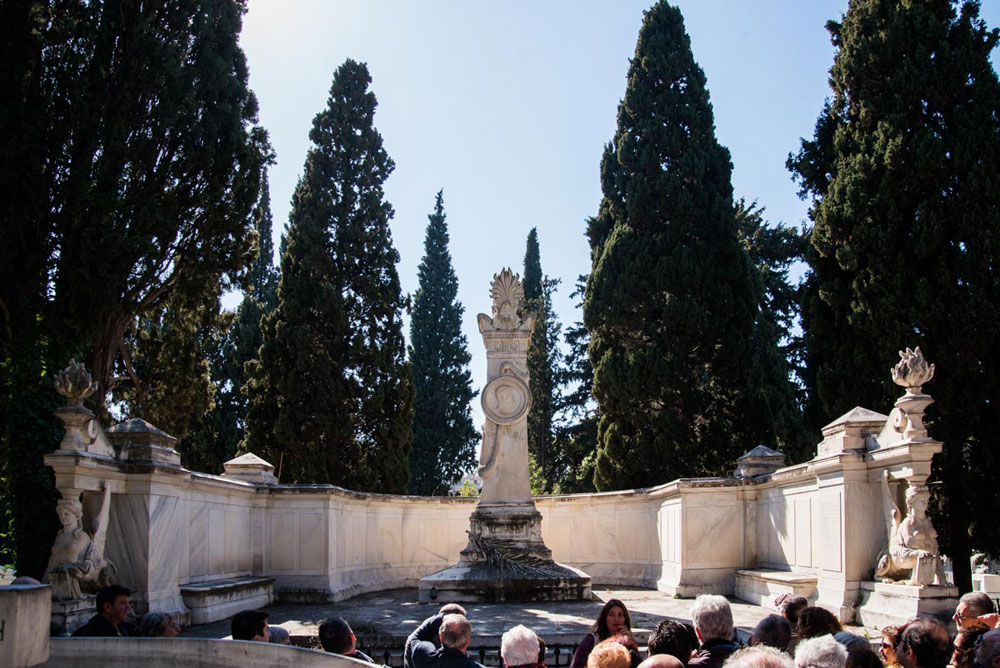 Περπατούσαμε ήσυχα ανάμεσα στους τάφους κάποιων εκ των πιο σπουδαίων Ελλήνων, όταν η Λαυρεντία Γιαννόλα μας διηγήθηκε το μύθο: Ο Κυπάρισσος ήταν, λέει, ένας όμορφος νεαρός που είχε σύντροφο ένα εξημερωμένο ιερό ελάφι, το οποίο κατά λάθος σκότωσε ένα απόγευμα με το ακόντιό του. Απαρηγόρητος ο Κυπάρισσος, θέλησε να πεθάνει και ζήτησε ως χάρη από τον ουρανό τα δάκρυά του να κυλούν αιώνια. Ο θεός Απόλλωνας, που αγαπούσε τον Κυπάρισσο, δεν κατάφερε να τον μεταπείσει και αποφάσισε να τον ανακουφίσει από τη δυστυχία του, μεταμορφώνοντάς τον για πάντα σε κυπαρίσσι, από το οποίο στην αιωνιότητα θα ρέουν πένθιμα δάκρυα (ρετσίνι). Για τους περισσότερο ρεαλιστές, τα κυπαρίσσια έχουν βαθύ ριζικό σύστημα που δεν απλώνεται και δεν ανασηκώνει το έδαφος, συνεπώς δεν επηρεάζει τα ταφικά μνημεία. Μετά σταματήσαμε μπροστά στον τάφο των Τρικούπηδων. Χαρίλαος, Σοφία, Σπυρίδων, Αικατερίνη. Ένας ξύλινος σταυρός για τον καθένα. «Πολλές φορές στο νεκροταφείο», είπε η Λαυρεντία, «γίνεται επίδειξη πλούτου και κοινωνικής θέσης. Όχι όμως πάντα». Ακολούθησαν σχόλια, κάποιος είπε ότι θα προτιμούσε ο τάφος του να έχει ένα σπουδαίο γλυπτό από ένα σκέτο ξύλινο σταυρό. Κάποιος άλλος βρήκε τη διαδικασία του ενταφιασμού πολύ αποπνικτική και την ιδέα της αποτέφρωσης περισσότερο ενδιαφέρουσα. Κι εγώ αποχώρησα βιαστικά γιατί ο ήλιος είχε αρχίσει να πέφτει.