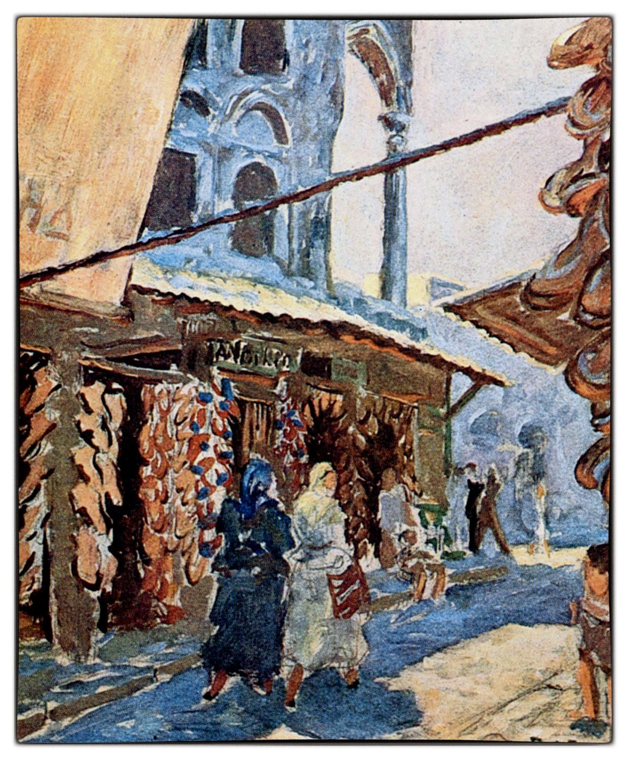 Στις οχτώ το βράδυ, το καλοκαίρι, το παζάρι παίρνει μιά νεραϊδένια όψη. Είναι ή ώρα που οι εργάτες, οι υπηρέτες, οι φαντάροι, έρχονται να ψωνίσουν κάτι για να φάνε… μοιράζονται στα εφτά με οχτώ ένα αρνίσιο κεφαλάκι με έξη πεντάρες.