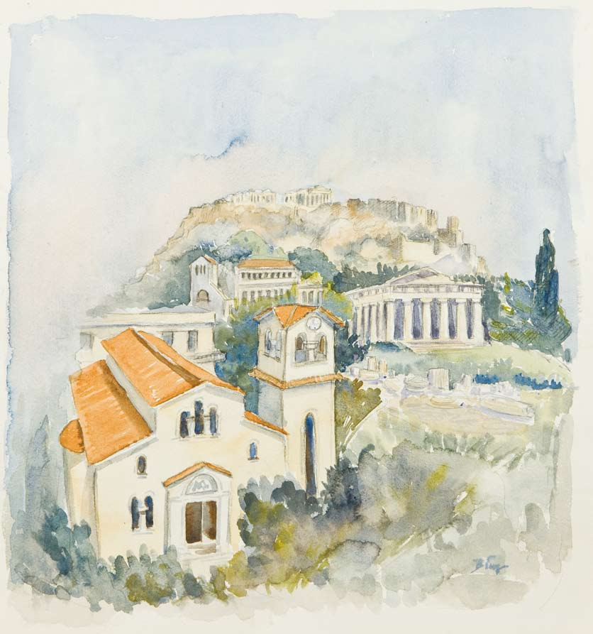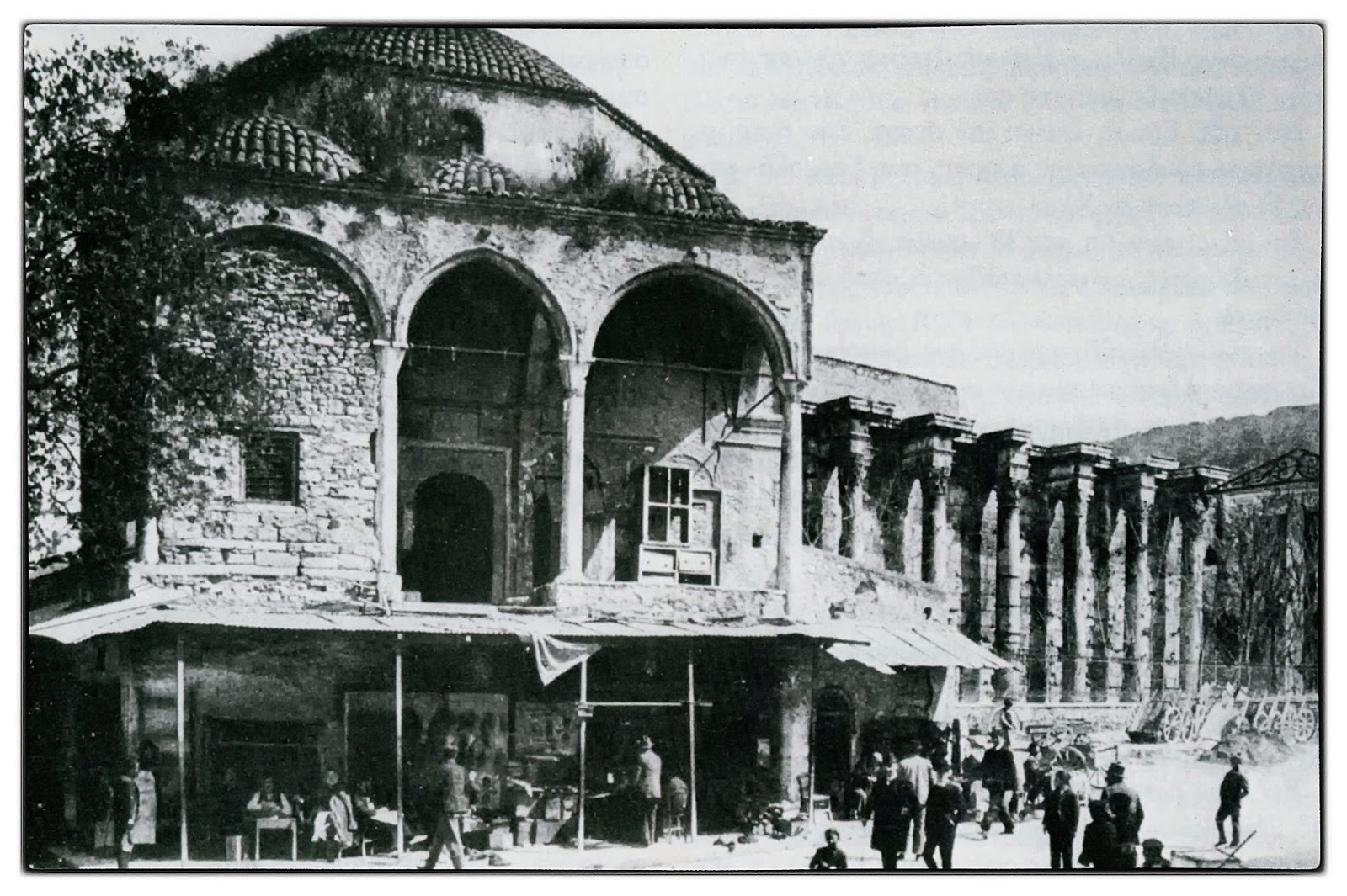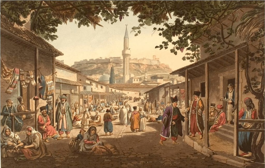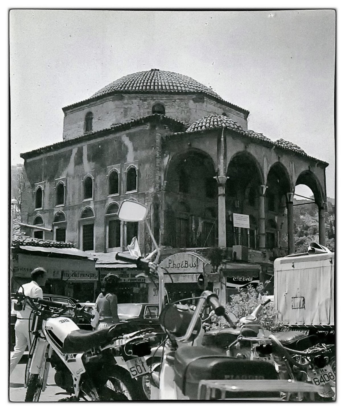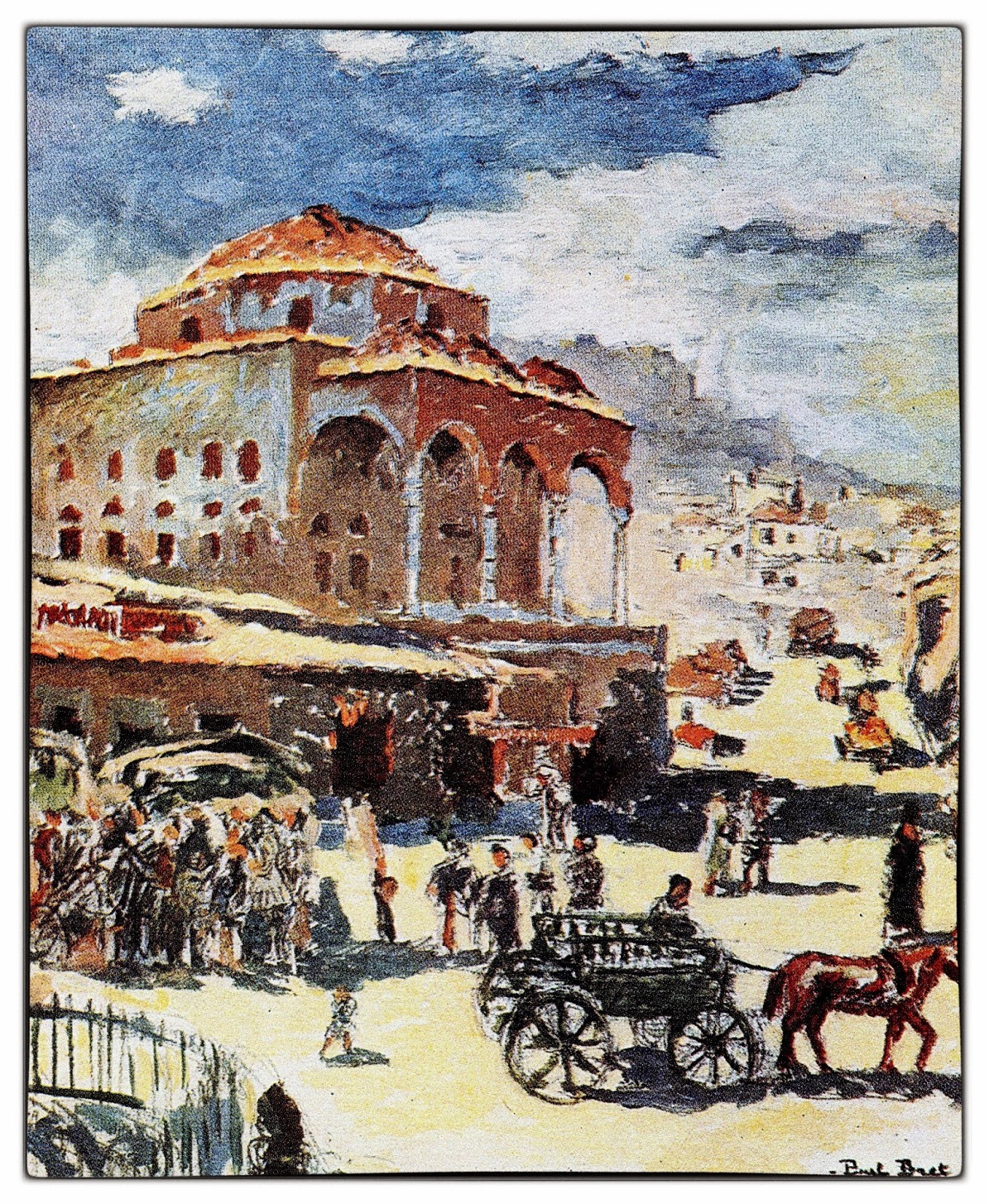 Ήδη υψούτο προ ημών βαρύ και άκομψον το μέγα τουρκικόν τζαμίον δεσπόζον της μικράς της πόλεως αγοράς. Κάτωθεν αυτού μία σειρά μικρών και σκοτεινών καταστημάτων, εις τα όποια ράπτονται εγχώρια ενδύματα και υποδήματα και απέναντι η μεγάλη τουρκική κρήνη γέμουσα επιγραφών και φέρουσα κεχαραγμένα το ονόματα όλων των κατά καιρούς διοικητών των Αθηνών.