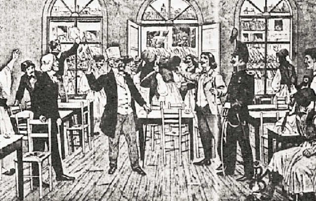Στις ταβέρνες της οθωνικής εποχής, σε περιόδους προεκλογικές, προσφερόταν δωρεάν κρασί απ’ τους κομματάρχες. Εκεί, ανάμεσα στους άνεργους, στρατολογούσαν και τους μπράβους — απαραίτητο τότε συμπλήρωμα των προεκλογικών αγώνων. Καθώς στην εποχή του Όθωνα ισχύει η δεκαπεντάωρη εργασία, το παζάρι μένει ανοιχτό από νωρίς το πρωί μέχρι αργά το βράδυ. Όλος ο ανδρικός πληθυσμός της Αθήνας δίνει το παρών στην αγορά, τουλάχιστον μια φορά τη μέρα.