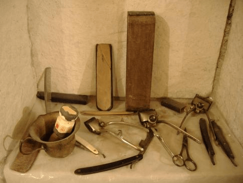 Τα κουρεία ήταν εγκατεστημένα κυρίως στις δύο πλευρές της εισόδου του Πάνω Παζαριού, στα Σκαλάκια της οδού Πανδρόσου που σώζονται ως τα σήμερα. Πετσέτες κυμάτιζαν σαν σημαίες στις πόρτες τους και τα βρωμικά νερά απ’ τα ξυρίσματα πετάγονταν βέβαια στο δρόμο. Οι Αθηναίοι ξυρίζονταν κυρίως τα Σαββατόβραδα, πληρώνοντας δέκα λεπτά. Δεκαπέντε λεπτά στοίχιζε το κούρεμα. Τα καλλυντικά ήταν ξίδι, ανθόνερο και μαντέκες από χοιρινό ξύγκι για τα μουστάκια και τα μαλλιά. Πίστευαν πως το λίπος δυναμώνει τις τρίχες, και τους χασάπηδες, που βρωμούσαν λίπος και μεδούλι απ’ τα σφαχτά, πηγή των καλλυντικών του τριχωτού μέρους του κεφαλιού τους, τους θαύμαζαν για τη δύναμη και τον ανδρισμό τους!