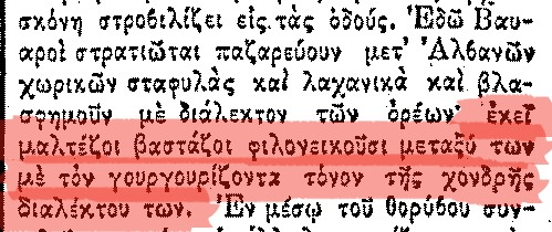 Στη διάρκεια της μέρας, όλ’ αυτά τα παληκάρια ντυμένα με φουστανέλες… γεμίζουν τις οδούς Ερμού, Αιόλου, Αθηνάς και τα πεζοδρόμια της Αγοράς…»