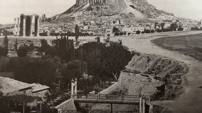Ξύλινα γεφύρια χρησίμευαν για να περνούν οι θεαταί πάνω από τον ξεροπόταμο και να φθάνουν στις πευκοφυτευμένες γύρω γύρω πλατείες των θεάτρων. Έκεί που σήμερα είναι στημένο το άγαλμα του Βύρωνος πάνω σε βραχώδες ύψωμα, τα περίφημα «Ολύμπια» του αειμνήστου Αναστασίου Τσόχα, αρχηγού της παλαιάς Αθηναϊκής οικογενείας.