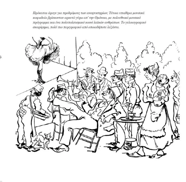 «Ο ταξιδιώτης που ήρχετο στας Αθήνας και ήταν υποχρεωμένος, λόγω παραμονής του στην πρωτεύουσα επί κάμποσες ημέρες, να περνάει μερικές ώρες στα καφενεία της Ομονοίας, θα παρατηρούσε πάντοτε στην ίδια θέση, στα ίδια τραπέζια, τους ίδιους τύπους.