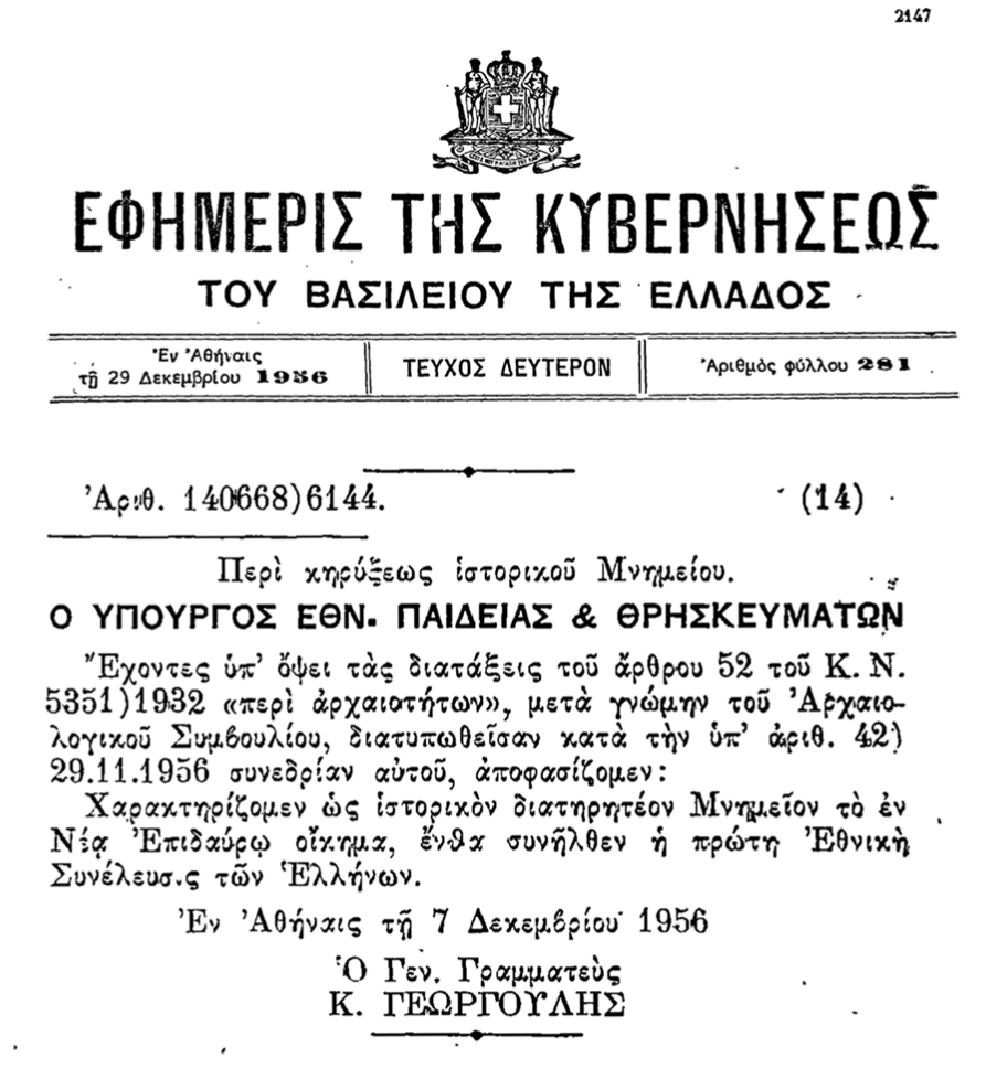 Απόφαση του Υπουργείου Εθνικής Παιδείας και Θρησκευμάτων για το χαρακτηρισμό του οικήματος όπου στεγάστηκε η γραμματεία της Α΄ Εθνοσυνέλευσης ως διατηρητέου ιστορικού μνημείου. ΦΕΚ Β΄ 281/29.12.1956, σ. 2149 Βιβλιοθήκη της Βουλής των Ελλήνων