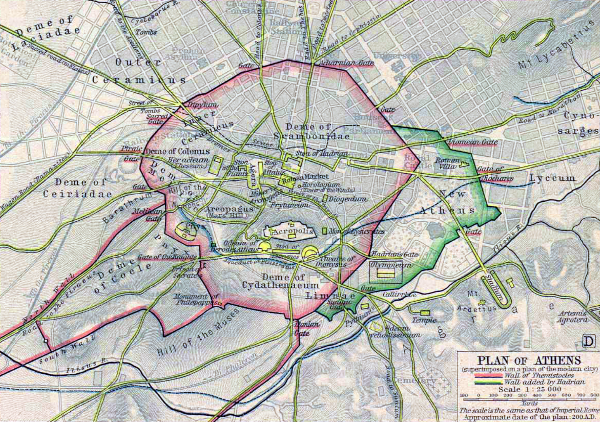 Χάρτης της Αθήνας του 200 μ.Χ., ο οποίος εμφανίζει κάτω αριστερά τον δήμο της Κοίλης, στα νοτιοδυτικά του άστεως εντός και εκτός του Θεμιστοκλείου τείχους.