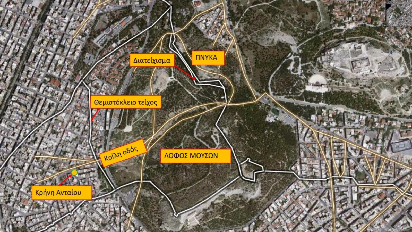 - Συνοικία Κοίλης: Στη χαράδρα ανάμεσα στον λόφο των Μουσών και την Πνύκα υπάρχει πυκνότατο οικιστικό πλέγμα.