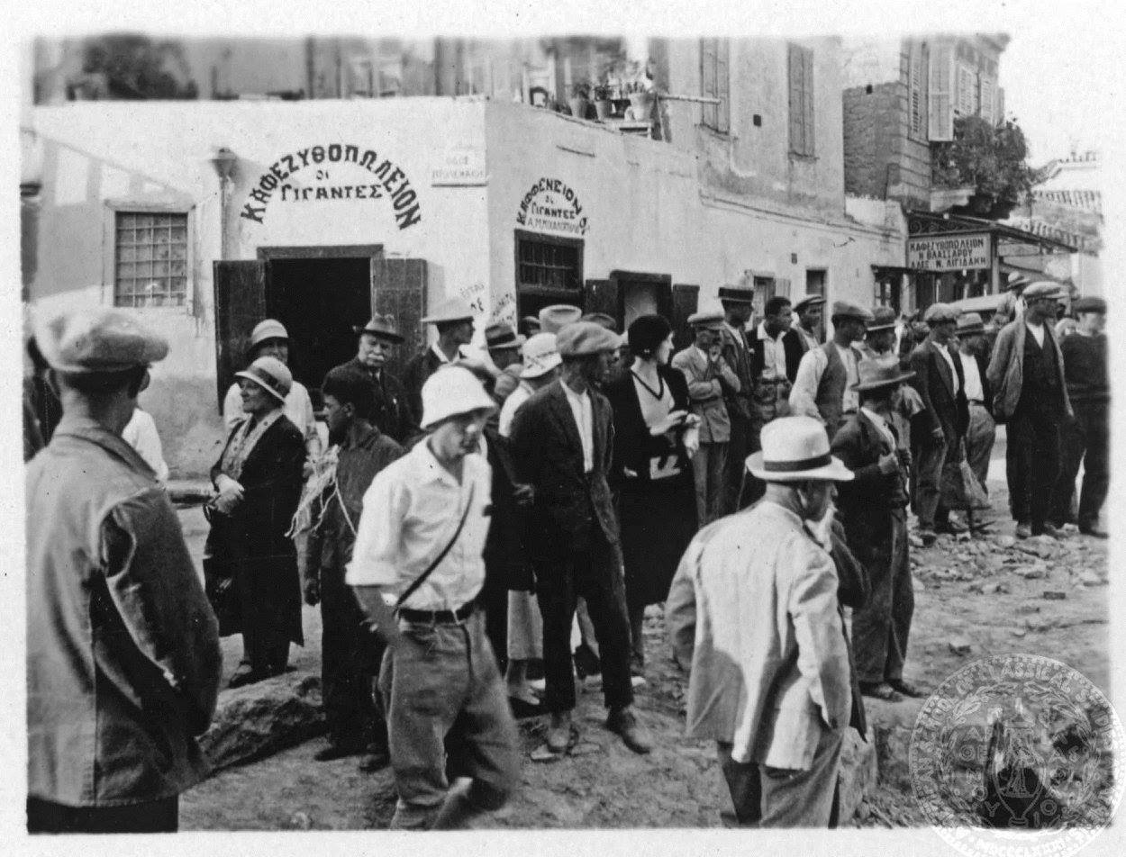 Ιούνιος 1931. Οδός Επωνύμων. Μια από τις σπάνιες φωτογραφίες που απαθανατίζουν το καφεζυθοπωλείο “Οι γίγαντες” του Μιχαλόπουλου στην συμβολή με την οδό Πτολεμαίου και στο βάθος το καφεζυθοπωλείο